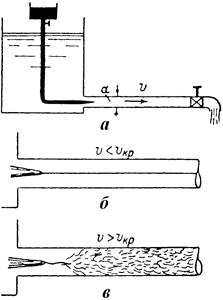 Эти режимы можно наблюдать на установке, состоящей из напорного бачка и прозрачной трубы (рис. 9.1, а), скорость течения в которой можно регулировать установленным в конце ее краном. В прозрачную трубу из специального бачка с помощью острого наконечника подводится краска, имеющая плотность, близкую к плотности жидкости. В зависимости от скорости протекания жидкости в трубе краска либо движется по длине трубы отдельной струйкой, не смешиваясь с жидкостью (рис. 9.1, б), либо перемешивается с жидкостью, (рис. 9.1, в). Первый режим движения жидкости называют ламинарным; он характе- ризуется параллельно-струйным течением, Рис. 9.1