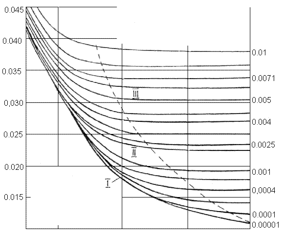 представлено рядом кривых, каждая из которых соответствует определённой относительной шероховатости, т.е. отношению k/d.