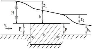 Незатопленный водослив. Незатопленный водослив с широким порогом характеризуется наличием двух перепадов свободной поверхности – в начале и в конце порога (рис. 17.11). Водослив считается незатопленным, когда уровень нижнего бьефа расположен ниже порога водослива, или когда высота подтопления меньше 0,8 напора, т.е. условие незатопленного водослива с широким порогом будет