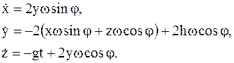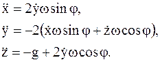 Спроектировав соотношение (2.6) на подвижные оси координат Оxyz, получим дифференциальные уравнения свободно падающей МТ с учетом неинерциальности системы отсчета: