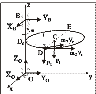 2Однородный диск массы m1, радиуса r вращается вокруг вертикальной оси z с постоянной угловой скоростью w0. В точке D0 находится МТ массы m2 (рис. 35). В некоторый момент времени МТ начинает двигаться по внешней окружности диска с постоянной относительной скоростью u. Определить угловую скорость диска w в тот момент, когда МТ достигает положения D (DE || Оx). МС состоит из двух частей: диска – АТТ и МТ.