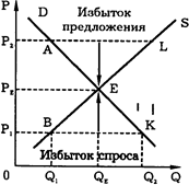 В ходе развития рынка осуществляется процесс взаимного приспособления продавцов и покупателей. Важную роль при этом играют цены, которые способствуют быстрому обмену необходимой информацией. Они делают условия обмена простыми, ясными и стандартизированными для всех участников рыночной экономики. Точка равновесия обозначается Е.