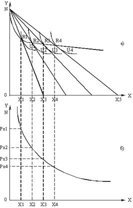 Дальнейшее снижение цены соответственно отражают прямые NX4, NX5 и т.д. Обозначив точки касания кривых безразличия U1, U2, U3, U4, с бюджетными ограничениями точками R1, R2, R3, R4 и соединив их, мы получим кривую «цена – потребление». На базе этой кривой может быть легко построена кривая спроса, в этом случае на оси ординат откладывается цена товара Х(РХ), а на оси абсцисс – количество блага Х.