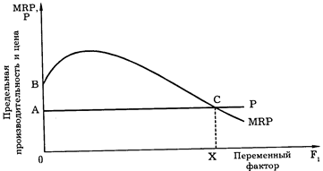 Правило максимизации прибыли.При совершенной конкуренции цены благ и цены ресурсов являются заданными, независимыми от данного производителя величинами. Отсюда можно сделать вывод, что предельная производительность какого-либо ресурса в денежном выражении будет иметь ту же динамику изменения, что и предельная производительность в натуральном («физическом») выражении, поскольку, чтобы получить первую, достаточно вторую умножить на постоянную цену. Ресурс поэтому будет находить применение в производстве до тех пор, пока его предельная производительность в денежном выражении будет не ниже его цены (рис.). Это означает, что цена ресурсов измеряет предельную производительность этих факторов. Если цена ресурсов равна Р, а кривая ВС является стоимостным выражением предельной производительности MRP, то производство будет продолжаться до тех пор, пока MRP не будет равно Р (см. рис.). В этом случае производитель будет максимизировать свой доход.