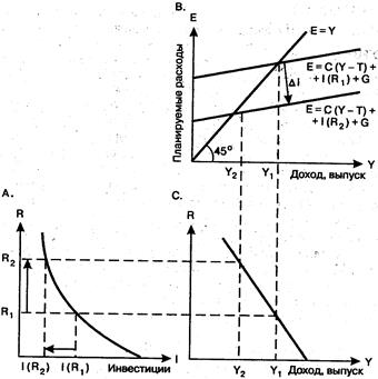 В:изображен «кейнсианский крест»: уменьшение планируемых инвестиций с I(R1) до I(R2) сокращает доход с Y1 до Y2.
