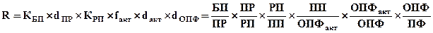 где: КРП – коэффициент соотношения реализованной продукции и произведенной продукции (коэффициент реализации продукции); fакт – фондоотдача активной части ОПФ; dакт – доля активной части ОПФ в общей величине ОПФ; dОПФ – доля ОПФ в производственных фондах.