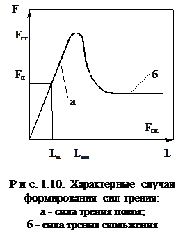 Силой трения покоя (Fn) называют сдвиговое усилие, прикладываемое к контактирующим телам, и не вызывающее их взаимного скольжения (см. рис. 1.10,а). При этом взаимное перемещение (Ln) достигается за счет деформации материала выступов шероховатости в зоне контакта и называется предварительным смещением. Оно носит в основном упругий характер и исчезает при снятии сдвигающего усилия. Однако по мере роста сдвигающего усилия предварительное смещение приобретает пластический характер и становится частично необратимым. На рисунке показана предельная величина предварительного смещения (Lпм) и соответственно предельное значение силы трения покоя, которое называют статической силой трения. При дальнейшем увеличении перемещения начинается скольжение.