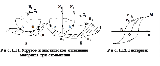 На рис. 1.11,а показано скольжение жесткого сферического выступа по вязкоупругому полупространству. Материал после прохода выступа из-за запаздывания деформации по отношению к нагрузке не успевает восстанавливать форму. Поэтому выступы перед индентором и после несимметричны, а реакция опоры, приложенная в центре контактной поверхности, не совпадает по направлению с нормальным усилием . Это явление характеризуется гистерезисом деформации. На рис. 1.12 показана кривая гистерезиса при растяжении-сжатии вязкоупругого стержня. Кривая ОМ отражает процесс нагружения, а кривая MN - процесс разгрузки. Из-за запаздывания деформации в тот момент, когда напряжение равно нулю, деформация не исчезает и равна eо. Поэтому след, оставшийся при движе