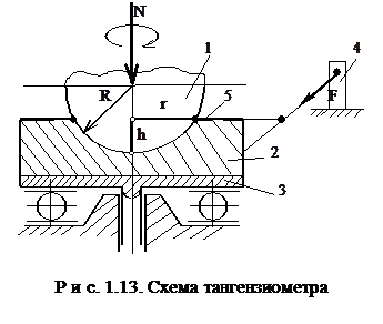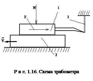 Для измерения силы трения применяют различные трибометры. На них изучают трение образцов в виде дисков, контактирующих торцами; цилиндров, контактирующих по образующей, и т.д. Наиболее простым и часто используемым является трибометр, схема которого изображена на рис. 1.16.