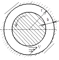 Минимальной зазор возникает в сечении, смещенном на угол b. Для того чтобы выразить подъемную силу масляного клина, силу вязкого трения и минимальную толщину зазора, необходимо решать уравнение Рейнольдса. Для жестких элементов пары трения, несжимаемой жидкости и стационарного течения это уравнение в интегральной форме имеет вид