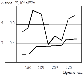 Отметим, что при изнашивании поверхностей трения контактная жесткость нестабильна во времени. По мере изнашивания поверхностей трения изменяется их физическое состояние. После отделения очередной порции частиц износа, что будет подробнее рассмотрено ниже, поверхность становится более гладкой и жесткой. Но по мере накопления повреждаемости она как бы разрыхляется, и жесткость снова падает до момента очередного отделения частиц износа. Такие циклы изменения жесткости во времени в одном из узлов трения при форсированном режиме испытаний показаны на рис. 2.5. Цикл изменения контактной жесткости, например в паре «чугун-сталь», составляет примерно 20 часов непрерывной наработки. За это время значение жесткости изменяется почти в два раза.