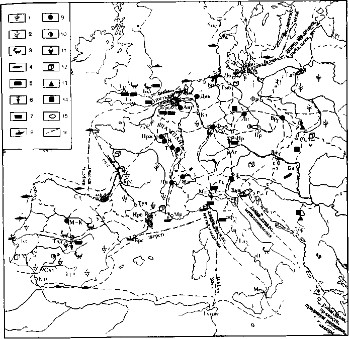 1 — виноградарства, 2 — зернового хозяйства, 3 — скотоводства; 4 — центры промыслово-ю рыболовства, 5 — области значительного производства шерсти и тканей. Крупнейшие центры 6 — оружейного дела, 7 — металлообработки, 8 — судостроения, 9 — крупнейшие ярмарки. Места добычи 10 — серебра; 11— ртути, 12 — поваренной соли, 13 — свинца, 14 — меди; /5 — олова, 16 — важнейшие торговые пути Ст — Стокгольм, Р — Рига, Кп — Копенгаген, Лб — Любек, Рс — Росток, Гд — Гданьск, Бр — Бремен, Фр — Франкфурт-на-Одере, Лп — Лейпцш, Вр -Вроцлав, Гмб — Гамбург, Ант — Антверпен Брг — Брюгге, Дев — Девентер Кл — Кельн. Фрф — Франкфурт-на-Майне, Нр — Нюрен-берг, Пр — Прага, Аг — Аугсбург, Бц — Больцано, Вн — Вена, бд — Буда, Жн — Женева, Лн — Лион, Мр — Марсель, Мл — Милан, Внц — Венеция, Дбр — Дубровник Фл — Флоренция, Нп — Неаполь, Мее — Мессина, Брс — Барселона, Нрб — Нарбона Кдс — Кадис, Свл — Севилья, Лбе — Лиссабон, М-К — Медина дель Кампо, Тлд — Толедо, Снт — Сантандер, Грн — Гранада, Тул — Тулуза, Брд — Бордо, Л — Ланьи, П — Провен, Т — Труа, Б — Бар, Прж — Париж, Рн — Р>ан, Прс — Портсмут, Брл — Бристоль, Лнд — Лондон.