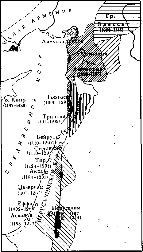 Государства крестоносцев на Ближнем Востоке. Редкой штриховкой показана территория крестоносных государств в период их наибольшей экспансии (XI — XII вв.); частой штриховкой — в первой половине XIII в.; указаны годы установления и падения власти крестоносцев