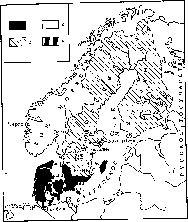 1 — королевство Дания во второй половине XIV в Территории, объединенные с Данией по Кальмарской унии (1397); 2 — королевство Норвегия (в унии с 1330 г.); 3 — королевство Швеция (в унии с 1397 г.); 4 — герцогство Голштиния (в унии с 1460 г).
