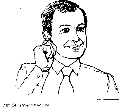 Фактически этот жест вызван желанием слушающего отгородиться от слов, положив руку около или сверху уха. Этот жест является взрослой усовершенствованной модификацией жеста маленького ребенка, когда он затыкает уши, чтобы не выслушивать упреков родителей. Другими вариантами прикосновения к уху является потирание ушной раковины, сверление в ухе (кончиком пальца), потягивание мочки уха или сгибание уха в попытке прикрыть им слуховое отверстие. Этот последний жест говорит о том, что человек наслушался вдоволь и хочет, возможно, высказаться.