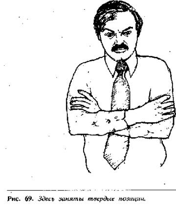 Продавцам следует проанализировать ситуацию, когда они видят, что покупатель сделал этот жест, и посмотреть, правильно ли они ведут переговоры. Если жест, с применением вертикально поставлен-ных больших пальцев, появился в конце презентации товара, и если он сопровождается рядом других положительных жестов со стороны покупателя, то агент по продаже может спокойно завершать презентацию и вести речь о заказе. Если же в конце презентации покупатель принимает позу скрещенных рук со сжатыми кулаками (рис.68) и делает совершенно безучастное лицо, спрашивать о заказе не следует, иначе могут быть трагические последствия. Вместо этого лучше вернуться к презентации товара и задать несколько вопросов, чтобы выяснить, в чем заключаются возражения покупателя. В переговорах о продаже очень трудно заставить покупателя изменить свое решение, если он произнес: "Нет". Умение понимать язык телодвижений позволяет вам видеть, что человек принял негативное решение до того, как .он произнесет его, и это дает вам возможность и время изменить ход дела.