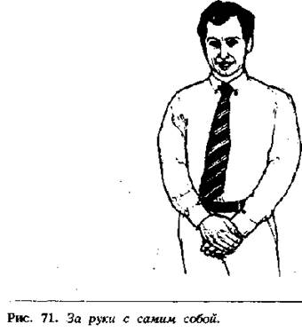 Социальный статус оказывает влияние на характер жеста, связанного со скрещиванием рук. Человек, занимающий более высокое социальное положение, может подчеркнуть свое превосходство тем, что будет постоянно держать руки скрещенными в присутствии людей, только что ему представленных. Допустим, что на официальном приеме главному управляющему только что представили несколько новых сотрудников, с которыми он ранее не был знаком. Поприветствовав их доминантным рукопожатием, он отодвигается от них на расстояние социальной зоны, а руки держит за спиной, заложив их в позу, характерную для начальника (рис.42), или держит одну руку в кармане. Он держит руки скрещенными совсем не потому, что испытывает нервозность. Новые члены компании, с другой стороны, поздоровавшись за руку с боссом, примут позу полностью или частично скрещенных рук, потому что они находятся в присутствии высокопоставленного лица. И главный управляющий, и новые сотрудники чувствуют себя удобно, выполняя те или иные жесты, т.к. каждый демонстрирует ими свой социальный статус относительно другого. Но что происходит в случае, если главный управляющий знакомится с молодым, перспективным руководителем отдела, который даже может претендовать на то, что он по положению не менее важен, чем главный управляющий. По всей вероятности, после того, как оба обменяются властным рукопожатием, молодой администратор сложит руки на груди, поставив большие пальцы вертикально (рис70). Этот оборонительный жест является модифика-цией жеста, в котором оба больших пальца вытянутых горизонтально вперед рук поставлены вверх, что указывает на уверенность и самообладание человека. Этот жест применялся Генри Уинклсером в телесериале "Счастливые дни". Когда мы поднимаем большие пальцы вверх, мы показываем, что чувствуем себя уверенно, а скрещенные руки дают ощущение защищенности.