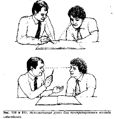 Имеет смысл поговорить сейчас о том, как контролировать взгляд человека во время зрительного представления ему книг, таблиц, графиков и т.д. Исследования показывают, что 87% информации поступает в человеческий мозг через зрительные рецепторы, 9% через слуховые и 4% через другие органы чувств. Если, например, вы показываете человеку ваше наглядное пособие и одновременно рассказываете о нем, он усвоит только 9% вашего сообщения, если только оно непосредственно не связано с тем, что он видит. Если ваше сообщение связано с наглядным пособием, то при его разглядывании он усвоит только 25-30% вашего сообщения. Чтобы установить максимальный контроль над его вниманием, используйте ручку или указку для того, чтобы показывать на наглядном средстве и описывать то, что изображено (рис.110). Затем, отнимите ручку от наглядного средства и держите ее на линии ваших и его глаз (рис.111). Как за магнитом, его голова поднимется, и он будет смотреть вам в глаза, в результате чего будет видеть и слышать все, что вы ему будете говорить, и, следовательно, максимально поглощать информацию. Постарайтесь сделать так, чтобы ладонь другой руки была в поле зрения.