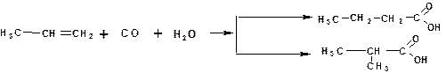 Взаимодействием олефинов с оксидом углерода (II) и водяным паром в присутствии катализатора (тетракарбонил никеля) получают смесь кислот нормального и изомерного строения: