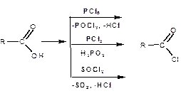 При действии галогенидов фосфора и хлорангидридов серы на карбоновые кислоты получаются галогенангидриды карбоновых кислот: