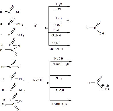 Производные карбоновых кислот способны подвергаться гидролизу в кислой или щелочной среде с образованием соответствующей кислоты или ее соли:
