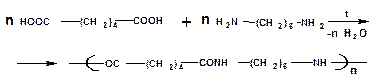 Из полиамидного волокна получаемого поликонденсацией адипиновой кислоты и гексаметилендиамина получают синтетическое волокно –найлон по свойствам близкое к натуральному шелку. Поликонденсация – образование полимерной системы с отщеплением низкомолекулярного соединения.