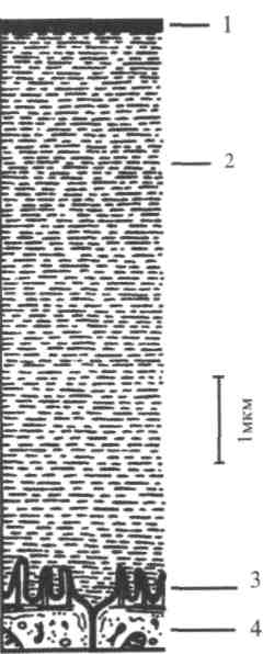 Рис. 5. Слоистая структура прероговичной слезной пленки: 1 – липидный слой; 2 – водянистый слой; 3 – микроворсинки переднего эпителия роговицы, покрытые муциновым слоем; 4 – клетки переднего эпителия роговицы.