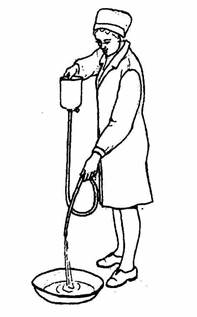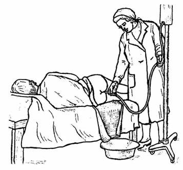 При постановке очистительной клизмы опорожняется только нижний отдел толстой кишки вследствие разжижения каловых масс и усиления перистальтики. Клизму выполняют в специальном помещении, клизменной. Где имеется кушетка, штатив-стойка для кружки Эсмарха, раковина, маркированные емкости для «чистых» и «грязных» кишечных наконечников. Поблизости должна находиться туалетная комната. Для постановки очистительной клизмы обычно используют воду комнатной температуры. При атонических запорах, связанных с ослаблением тонуса и нарушением двигательной активности кишечника, температуру воды снижают до 12-14оС. В этом случае тонус и перистальтика кишечника повышаются. При спастическом запоре, наоборот, необходимо снять повышенный тонус кишечника, поэтому воду нагревают до 37-38 оС. Кишечный зонд вводят в прямую кишку на глубину 10-12 см.
