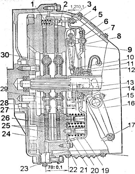 1 - отжимная пружина; 2 - шток; 3 - кольцо; 4 - планка; 5 - оттяжной рычаг; 6 - вилка оттяжного рычага; 7 - регулировочная гайка; 8 - опорная пластина; 9 - стопорная пластина; 10 - пружина оттяжного рычага; 11 - муфта выключения с подшипником; 12 - шланг для подвода смазкик муфте; 13 - вилка; 14 - упорное кольцо оттяжных рычагов; 15 - вал вилки выключения;
