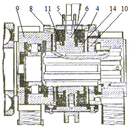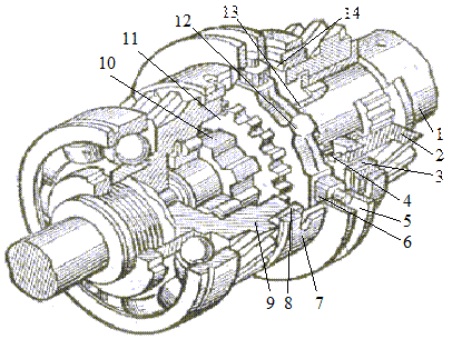1 - вторичный вал коробки передач; 2 - шестерня пятой передачи; 3, 8 - конусные кольца синхронизатора; 4 - конусное кольцо шестерни пятой передачи; 5 - муфта включения четвертой и пятой передач; 6 - каретка синхронизатора; 7 - корпус; 9 - первичный вал коробки передач; 10, 13 - зубчатые муфты синхронизатора включения четвертой и пятой передач; 11, 14 - зубчатые муфты; 12 - шарики фиксатора