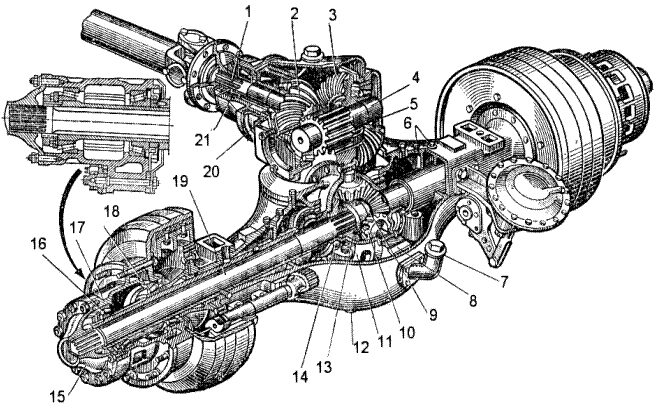 | 1 - вал ведущей конической шестерни; 2 - ведущая коническая шестерня; 3 - ведомая коническая шестерня; 4 - вал ведомой конической шестерни; 5 - ведущая цилиндрическая шестерня; 6 - сапуны; 7 - заливная горловина; 8 - ведомая цилиндрическая шестерня; 9 - крестовина; 10 - сателлит; 11 - чашка коробки дифференциала; 12 - пробка; 13 - полуосевая шестерня; 14 - шариковый подшипник; 15 - фланец; 16, 18 - конические роликовые подшипники; 17 - ступица колеса; 19 - полуось; 20, 21 - роликовые конические подшипники |