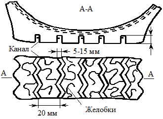 | Р и с. 5.10. Три основных типа рисунка протектора: а - зигзагообразный; б - ребристый; в – блочный | Р и с. 5.11. Каналы и желобки в типичном зигзагообразном рисунке протектора |