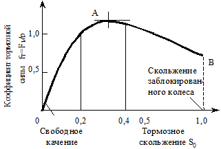 Как видно из рисунка, при торможении или разгоне в передней части пятна контакта проскальзывание отсутствует, но возникает скольжение в его задней части. Это обстоятельство определяет неустойчивость сил торможения или разгона. Они, в целом, меняются в зависимости от режима свободного качения до режима скольжения заблокированного колеса или работы колеса в режиме тягового скольжения.