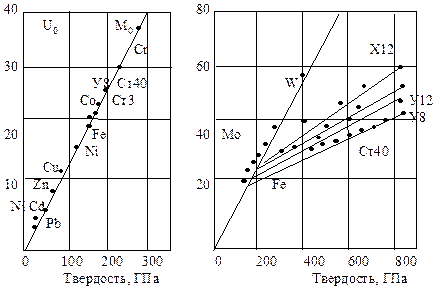 Привлекательность механического подхода для описания процесса разрушения при трении связана с достаточной простотой получения этих характеристик и, в некоторых случаях, возможностью описания износостойкости e при помощи несложных эмпирических зависимостей вида U = f (М), где М - механическая характеристика.