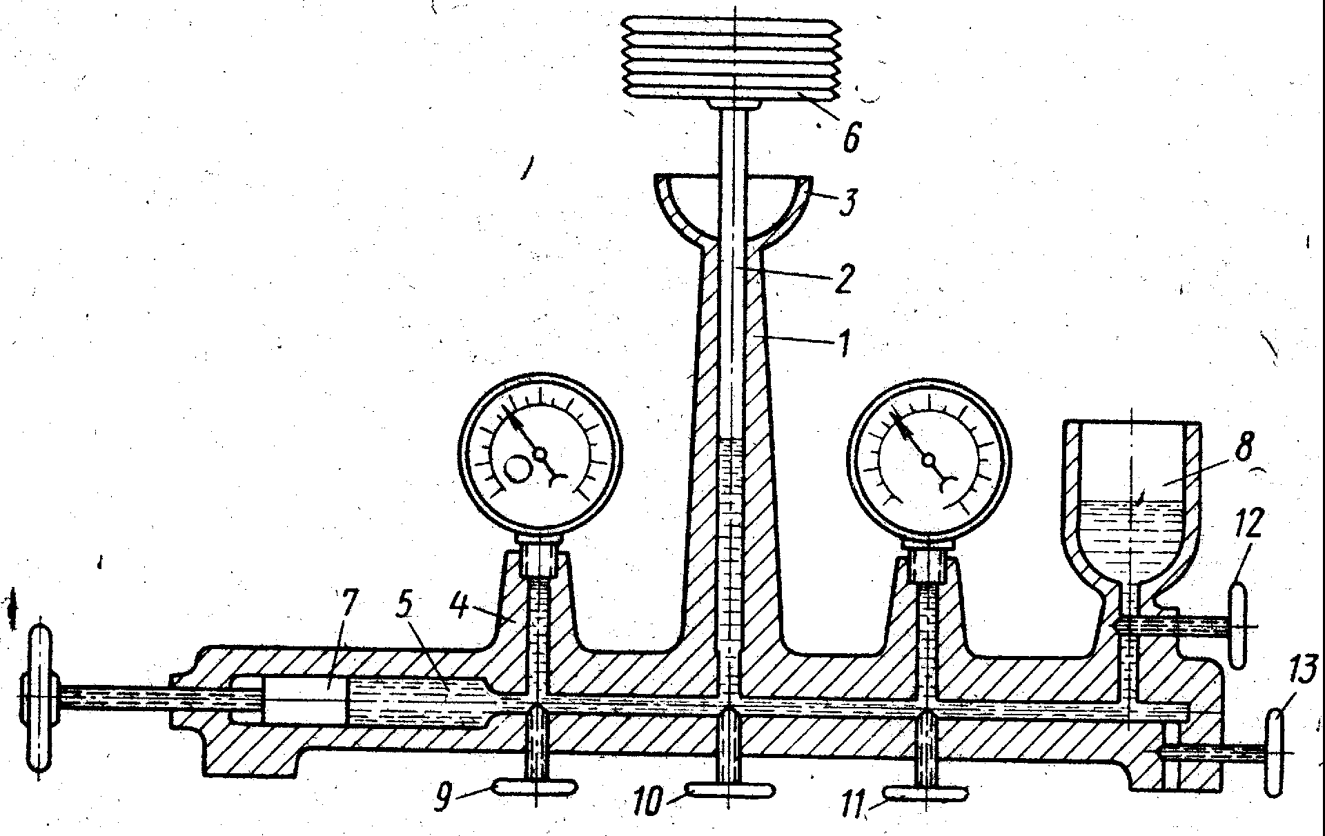 Образцовый грузопоршневой манометр (рис. 5) состоит из колонки, укрепленной на станине прибора, в которой имеется вертикальный цилиндрический канал, в нем движется пришлифованный поршень, несущий на верхнем конце тарелку для установки грузов. Верхняя часть колонки снабжена воронкой для сбора масла, просачивающегося через зазор между поршнем и цилиндром. В станине высверлен горизонтальный канал, в расширенной части которого движется посредством винтового штока поршень 7, уплотненный манжетами. Канал в станине соединяется с каналом колонки и каналами двух бобышек, предназначенных для укрепления поверяемых манометров. Кроме того, с каналом станины соединен канал воронки 8, которая служит для заполнения системы маслом. Каналы для отсоединения их от канала станины снабжены игольчатыми вентилями 9-12. Назначение вентиля 13 – спуск масла из прибора. Максимальное давление, создаваемое грузами, 4,90 МН/м2 (50 кгс/см2). Рассчитывается по формуле: