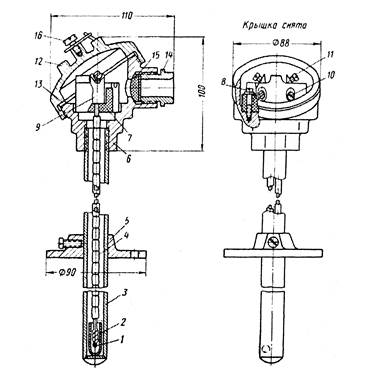 1 – горячий спай термопары; 2 – фарфоровый наконечник; 3 – защитная трубка; 4 – фарфоровые бусы; 5 – передвижной фланец для крепления термопары; 6 – корпус головки; 7 – фарфоровая колодка; 8 – винты для крепления колодки; 9 – зажимы; 10 – винты для крепления термоэлектродов в зажимах; 11 – винты для крепления проводов; 12 – крышка; 13 – прокладка; 14 – штуцер для вывода; 15 – асбестовый шнур; 16 – винт для цепочки.
