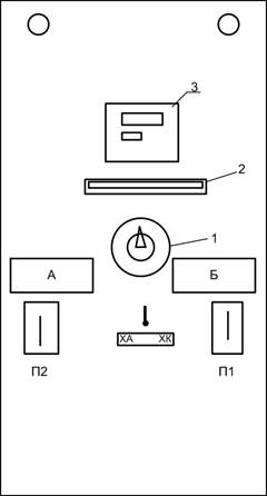 Температуру в печи и скорость ее нагрева устанавливают вращением рукояти лабораторного автотрансформатора 1. Поверяемые преобразователи ХА (поз.1-3) и ХК (поз.1-4) через переключатель П (1-5) выведены на милливольтметр 2 (поз.1-6). Температура свободных концов термоэлектропреобразователей измеряется термоэлектрическим термометром и отображается на зеленом индикаторе цифрового прибора ТРМ 200 (3), который находится на щите установки (рис. 8). Поверка преобразователей производится по показаниям прибора 3 (поз.1-2) – универсального цифрового прибора ТРМ 200, принимающего сигналы напряжения постоянного тока от преобразователя типа ХА и ХК (поз. 1-1).