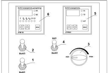 1 – тумблер включения стенда; 2 – тумблер включения лабораторной работы; 3 – ручка реостата, измеряющего сопротивление термопары; 4 – переключатель возмущения;5 – 2ТРМ 0; 6 – ТРМ 10.