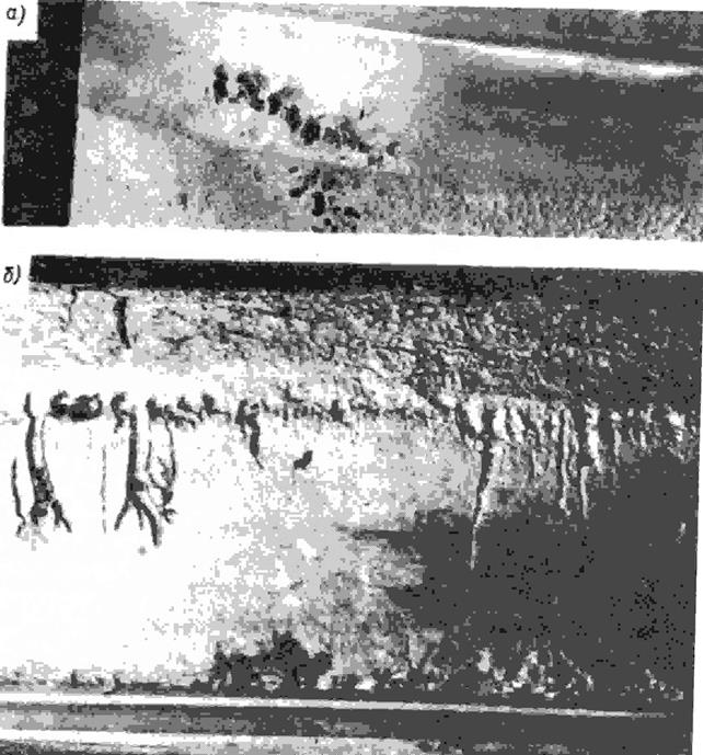Рис. 3. Характер кавитационных разрушений центрирующих поясов втулок цилиндров двигателя 6ДМ50М: а - верхнего пояса после 10 тыс. ч работы двигателя (БМРТ «Алтай»); б - нижнего пояса после 10 435 ч. работы двигателя (БМРТ «Березники»)[4]