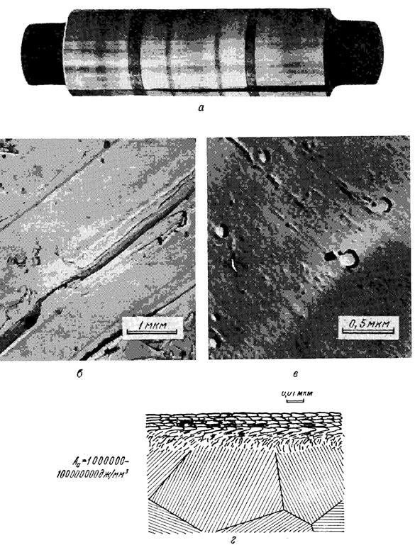 Рис. 7. Нормальный механохимический износ поршневого пальца авиационного двигателя: а - общий вид; б - электронная фотография поверхности трения (I тип вторичных структур); в - электронная фотография продуктов изнашивания; г - схема строения поверхностных слоев