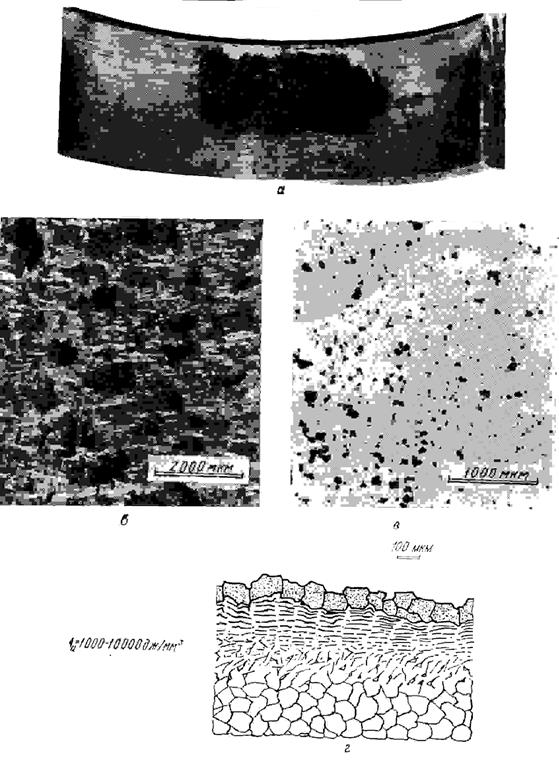 Рис. 15. Повреждаемость при питтинге (специфическая форма усталостного разрушения при трении качения) шестерни: а - общий вид; б - фотография поверхности трения; в - структура поверхностных слоев в сечении; г - схема строения поверхностных слоев