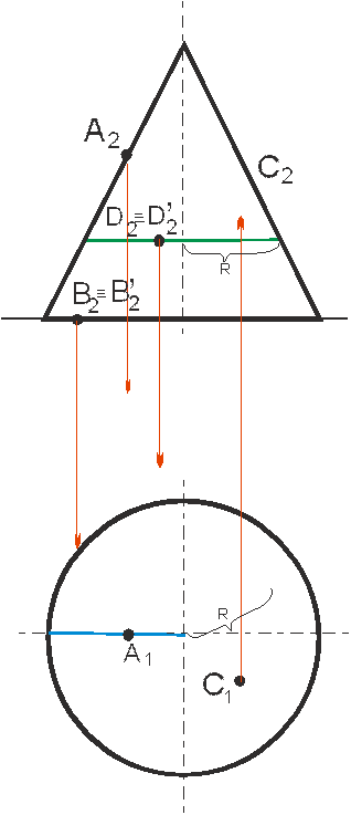 Рассмотрим построение проекций точек, принадлежащих поверхности конуса (рис.2), когда одна проекция точки задана. Проекция А2 принадлежит очерковой образующей, следовательно проекция А1 строится переносом по линии связи. На фронтальной проекции основания конуса расположена проекция точки В2, горизонтальных проекций можно построить две, на передней и задней стороне конуса, поэтому рассматриваем конкурирующие точки В и В`. На фронтальной проекции конуса зададим проекцию точки D2 и D2`.Для того чтобы построить вторые горизонтальные проекции точек необходимо использовать вспомогательные линии: параллель или образующие. Воспользуемся параллелью, для построения горизонтальной проекции параллели, радиусотмеряется всегда от оси вращения до очерковой образующей. Для построения фронтальной проекции точки С использована образующая, которую провели через заданную проекцию. Положение образующей на основании отмечено крестиком.