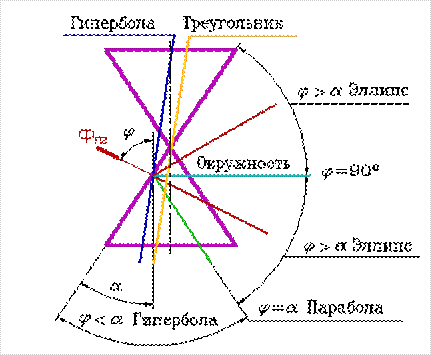 Если плоскость Ф параллельна одной образующей поверхности конуса, т.е. φ=α, то линией пересечения является парабола (рис.5). В случае, когда плоскость проходит через вершину конуса, линия пересечения совпадает с образующими. В сечении получается треугольник.