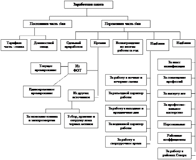 Заработная плата состоит из основной части, носящий постоянный характер, и дополнительный, имеющий переменный характер. Переменная часть представляет собой различные виды премий, доплат и надбавок.