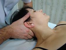 правая рука ладонной поверхностью 2-го пястно-фалангового сустава контактирует с затылочной костью пациента права, находясь по ее нижнему краю за сосцевидным отростком височной кости; II-V пальцы направлены влево, I палец над левым ухом ложится на височную кость пациента. Левая рука поддерживает голову пациента с левой стороны. Плечи и кисти врача свободны, локти не прижаты. Рис.54-55