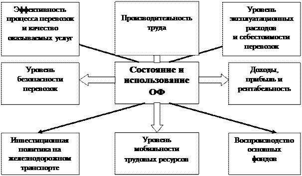 Показатели фондоотдачи и производительности подвижного состава дают неполную характеристику эффективности использования ОФ. На практике наблюдается более сложная взаимосвязь ОФ с важнейшими показателями деятельности железнодорожного транспорта. Схема такой взаимосвязи представлена на следующем рисунке.