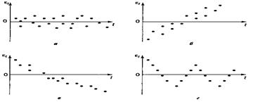Рассматривая последовательность остатков как временной ряд, можно построить график их зависимости от времени. В соответствии с предпосылками МНК остатки εt должны быть случайными (рис. 1 а). Однако при моделировании временных рядов нередко встречается ситуация, когда остатки содержат тенденцию (рис. 1 б) и в))или циклические колебания (рис.1 г)). Это свидетельствует о том, что каждое следующее значение остатков зависит от предшествующих. В этом случае говорят о наличии автокорреляции остатков.