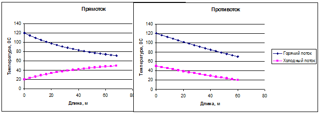 Рис. 5. Профиль изменения температур горячего и холодного потоков