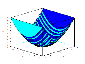 -->[x, y]=meshgrid([-3:0.15:3]); z=x.^2+y.^2; plot3d(x, y, z)