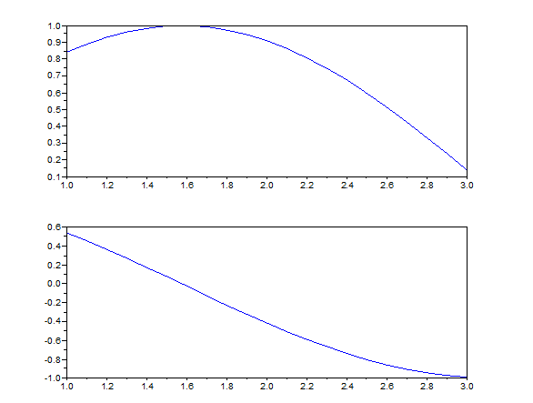 subplot(211),plot(x,sin(x));subplot(212),plot(x,cos(x))